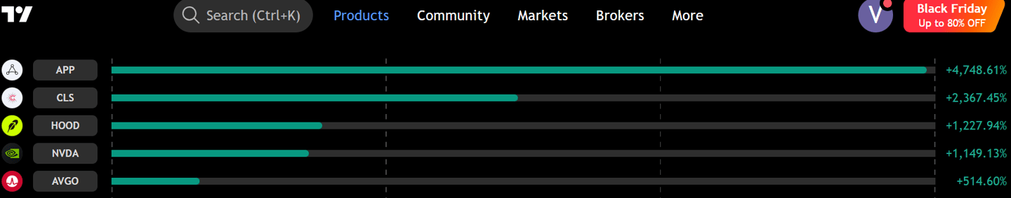 All performance shown is based on a TradingView model portfolio and does not represent an actual client account. Alpha Edge is included in our Buy & Hold subscription plans.