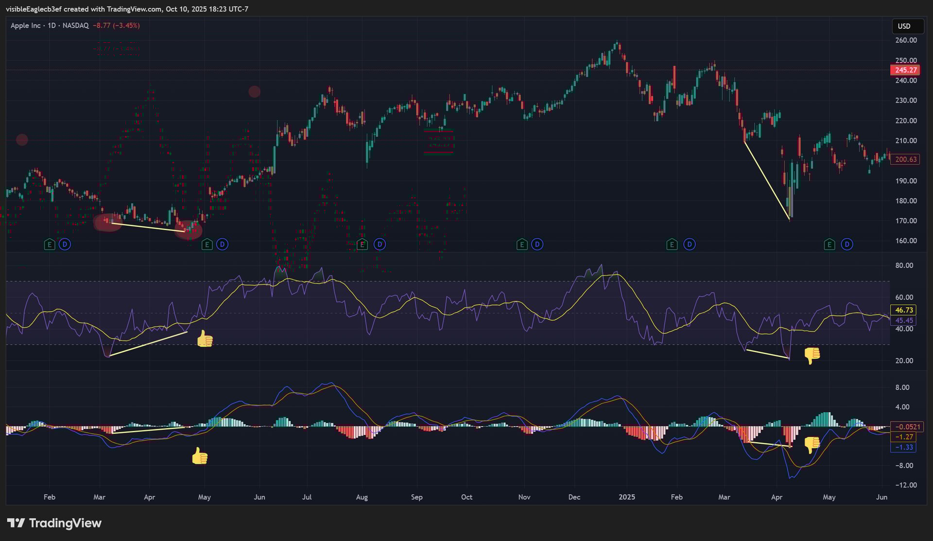 Let's examine real-world examples of RSI and MACD divergence from an Apple's stock chart. In May, 2024, the price had made a lower low. However, both indicators simultaneously formed a higher low. This established a clear bullish divergence, foreshadowing a powerful rally that propelled the price upward.